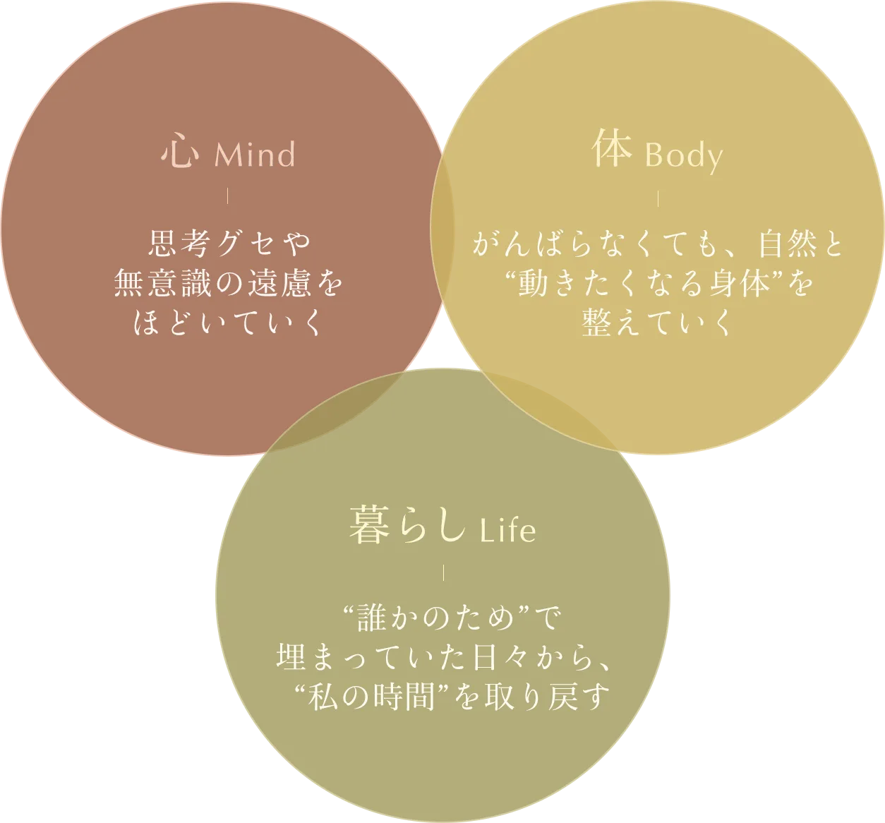 どれか一つだけを変えようとしても、追いつかない。だからこそ、40代からの変化には、マインド・ボディ・ライフ。この3つすべてを、“今の自分にとっての最適な状態”へと整えることが必要なのです。これまで積み重ねてきたものがある今だからこそ、“わたし軸”に整え直せます。